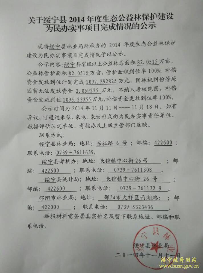 绥宁县2014年度生态公益林保护建设为民办实事项目完成情况公示