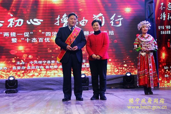 (绥宁县委副书记、县长罗玉梅为“十优项目建设功臣”代表夏辉颁奖)